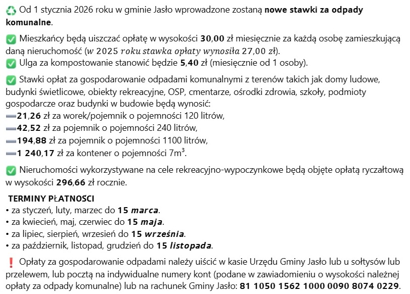 Nowe stawki za odpady komunalne Admin | 16 grudnia 2025 | Gmina Jasło | Brak komentarzy Powiązane Wpisy Zarządzenie Wójta Gminy Jasło Brak komentarzy | maj 15, 2015 Informacja Brak komentarzy | mar 6, 2018 Gminne Przedsiębiorstwo Komunalne w Jaśle informuje… Brak komentarzy | lip 29, 2022 Kolektory słoneczne – wznowiony nabór Brak komentarzy | lip 1, 2016 Dodaj KomentarzTwój adres e-mail nie zostanie opublikowany. Wymagane pola są oznaczone *Komentarz*Nazwa:* Email Adres:* Strona Internetowa: Zapisz moje dane, adres e-mail i witrynę w przeglądarce aby wypełnić dane podczas pisania kolejnych komentarzy. Δ This site uses Akismet to reduce spam. Learn how your comment data is processed.