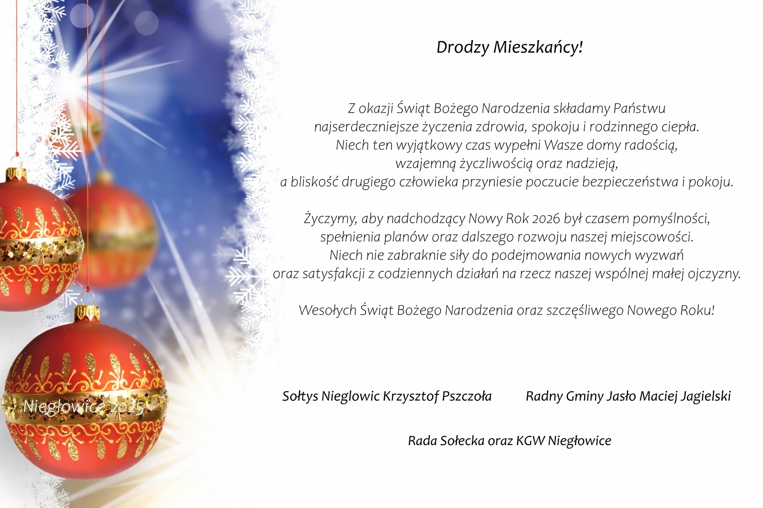 ŻYCZENIA ŚWIĄTECZNE 2025 Admin | 24 grudnia 2025 | Sołtys | Brak komentarzy Z okazji Świąt Bożego Narodzenia składamy Państwu… Tagi:życzenia bożonarodzeniowe 2025, życzenia świąteczne 2025 Powiązane Wpisy Opłata za podatek, odpady komunalne i kanalizację Brak komentarzy | wrz 9, 2022 Podziękowania dla Wyborców Brak komentarzy | cze 23, 2024 Opłata za podatek, kanalizację i odpady komunalne Brak komentarzy | maj 9, 2016 Zebranie Wiejskie 3 czerwca 2016 Brak komentarzy | maj 29, 2016 Dodaj KomentarzTwój adres e-mail nie zostanie opublikowany. Wymagane pola są oznaczone *Komentarz*Nazwa:* Email Adres:* Strona Internetowa: Zapisz moje dane, adres e-mail i witrynę w przeglądarce aby wypełnić dane podczas pisania kolejnych komentarzy. Δ This site uses Akismet to reduce spam. Learn how your comment data is processed.